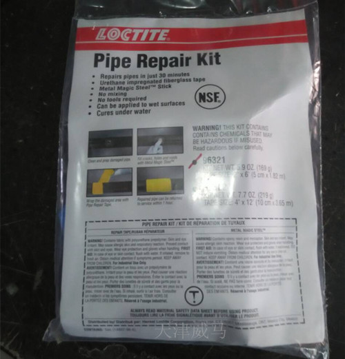 管子修理包是聚胺脂浸漬過的玻璃纖維帶,用水激活,可對金屬、塑料和復(fù)合管子進(jìn)行臨時可靠的修理,內(nèi)含金屬魔力膠棒和手套以及浸漬聚氨酯的玻璃纖維帶。10分鐘內(nèi)固化。符合USDA標(biāo)準(zhǔn),可偶爾與食品接觸。