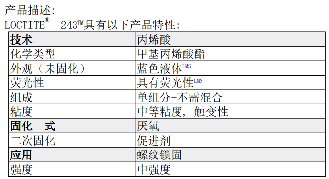 LOCTITE243通用型中等強度螺紋鎖固膠,適用于所有金屬螺紋組件。